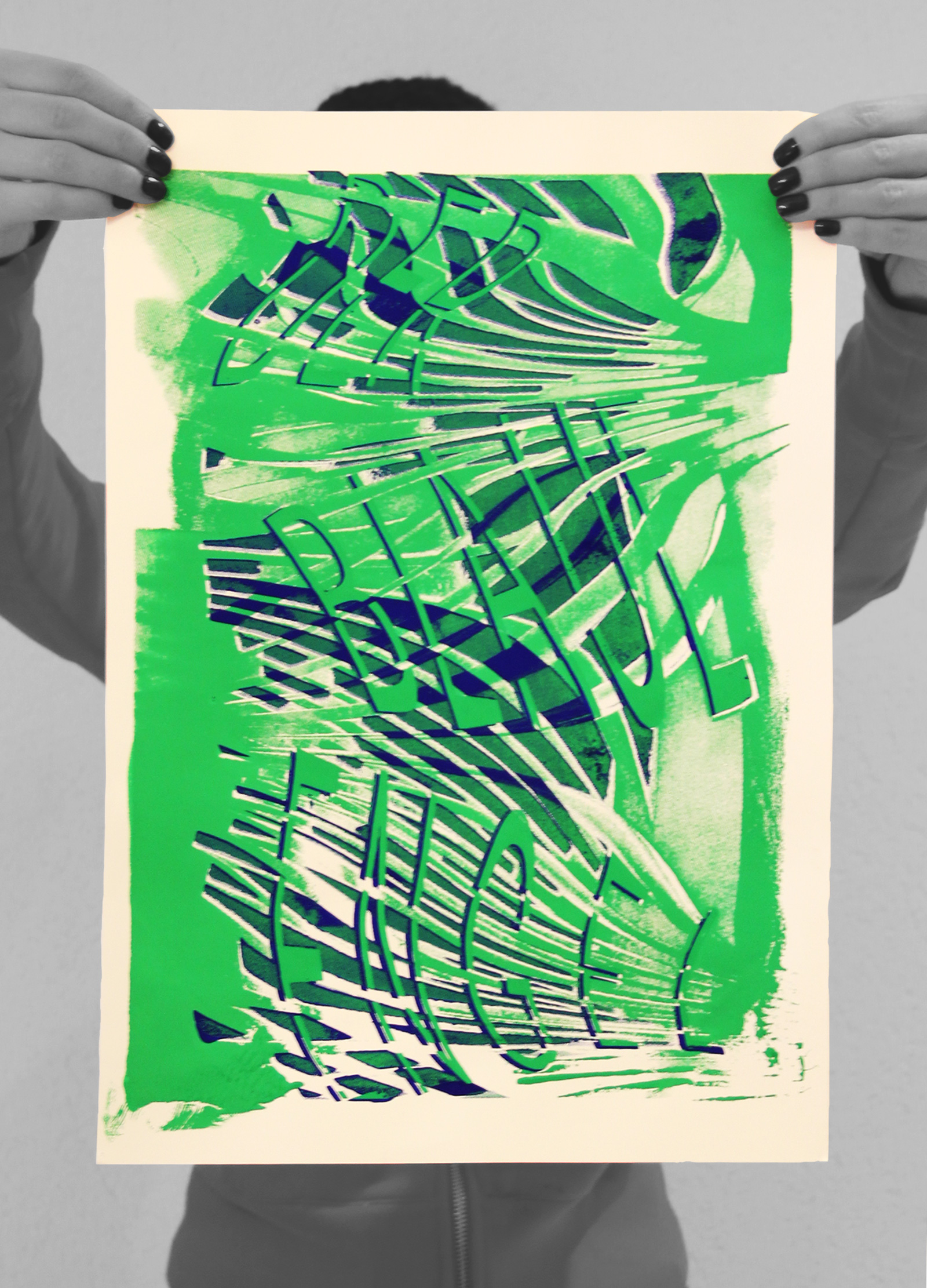 Die Arbeit verläuft ausschliesslich analog. Die Schrift als solche habe ich in den Hintergrund eingeflochten.